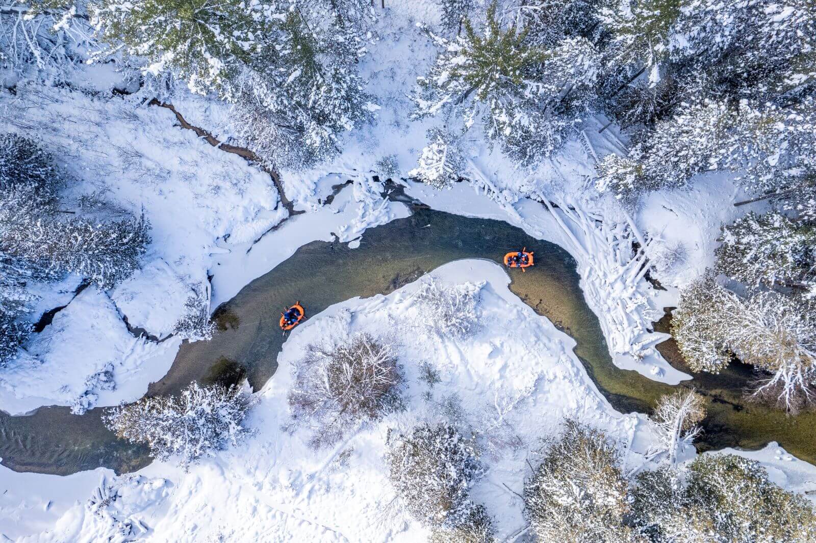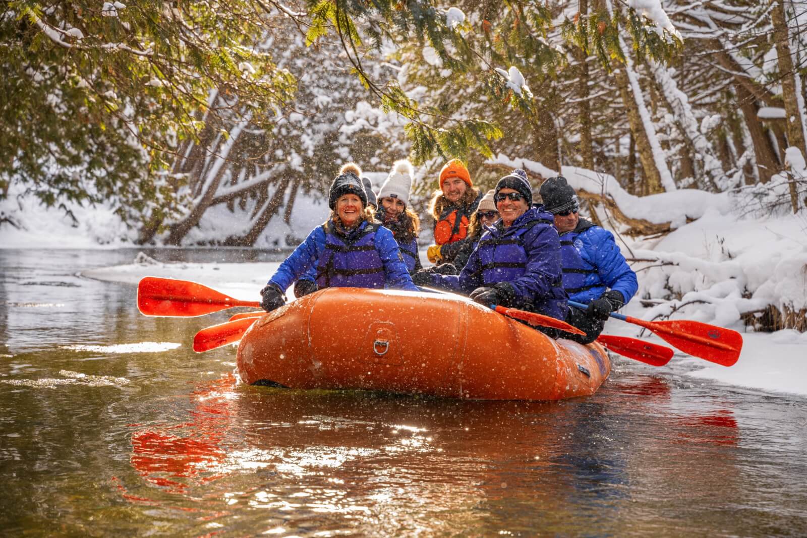 Before you shake your head and say “no way!” to winter rafting, let’s clear one thing up from the get-go: NO, YOU WILL NOT GET WET! This is a guided trip with experienced professionals calling the shots. If you’ve ever been spilled out of your kayak or canoe into the brisk waters of the Sturgeon River, we can understand your hesitation. But hear us out and keep reading because we would hate for you to go home without experiencing one of Gaylord, Michigan’s most extraordinary winter experiences.