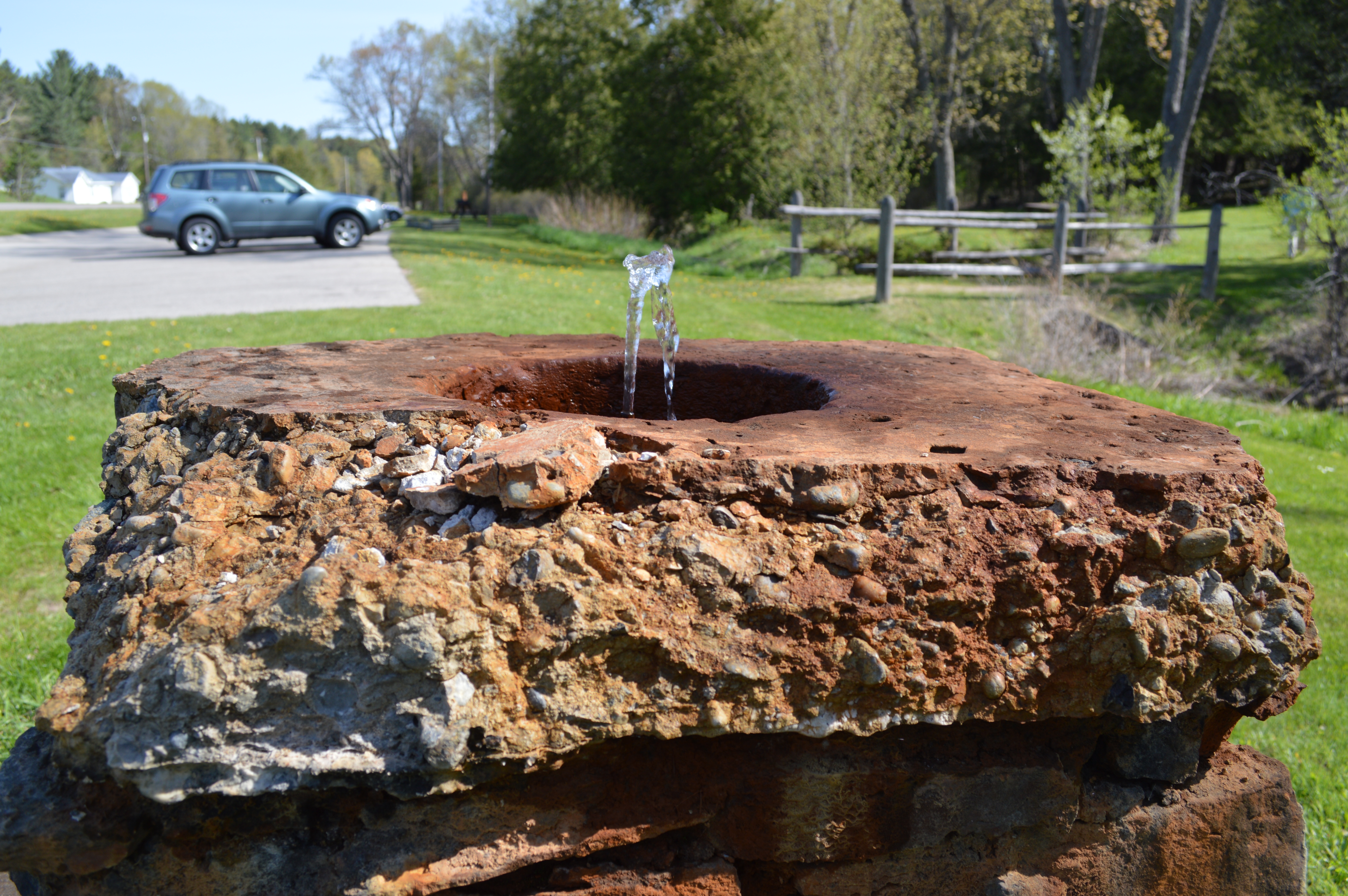 Imagine sitting in a rowboat on a pond then drilling a hole in the floor of your boat. A geyser of water will shoot up out of that hole just like in the cartoons. That’s essentially what’s happening at Irontone Springs – the well being the hole – but the park doesn’t flood because Mossback Creek carries that water away to the Sturgeon River.