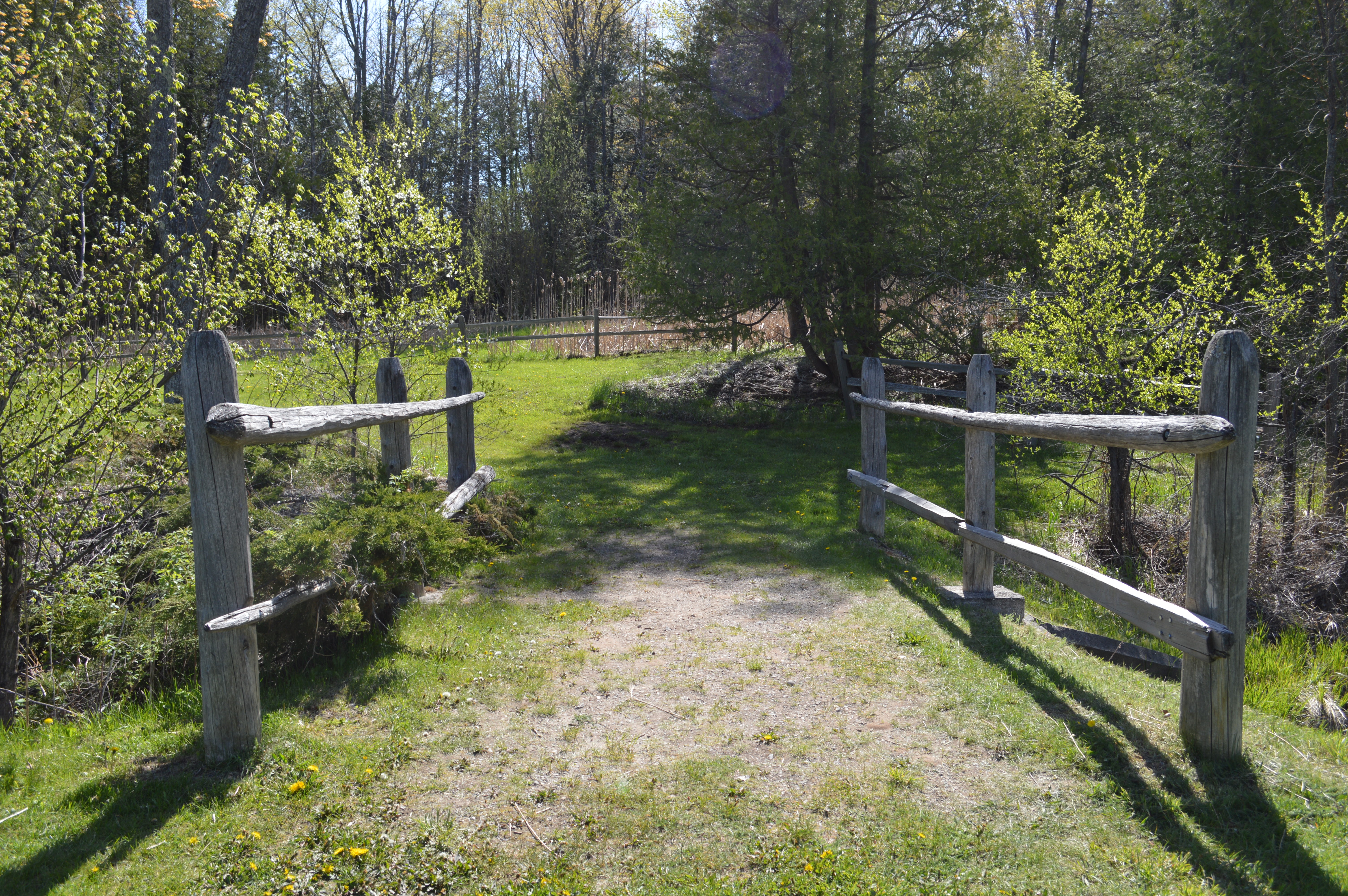 The first thing you’ll notice are the bridges crossing the small creek there. The stream is marked on the county map as Mossback Creek, one of the very early headwaters of the Sturgeon River which ends up in Burt Lake far to the north. If you’re nimble you can pull off a Jean-Claude Van Damme split and put one foot on each creek bank. Look down and you’ll see small fish darting in and out of the shady spots. Clean, cold headwaters like these are what make the Sturgeon River such a prime habitat for trout a little further downstream.