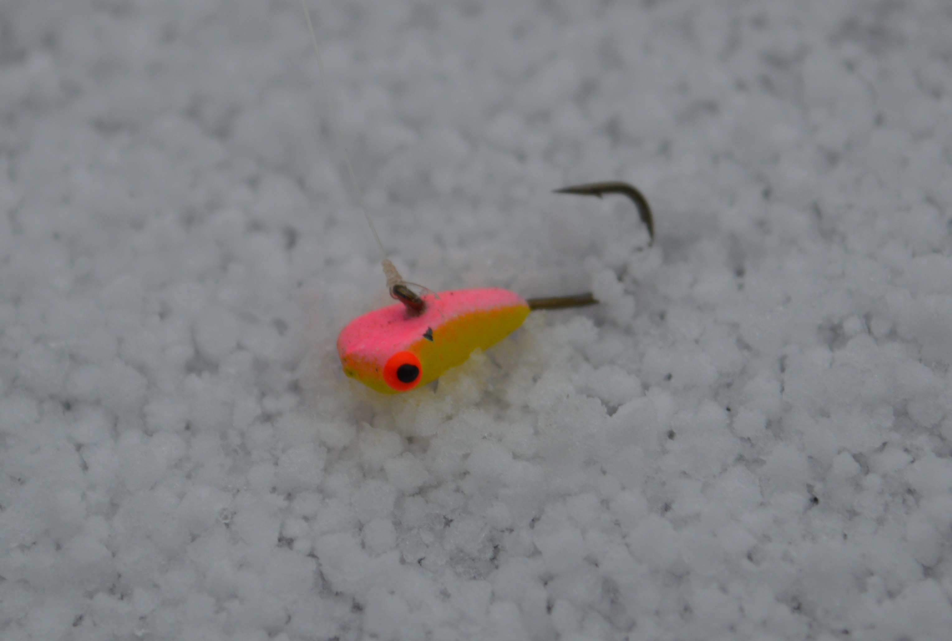 Just a warning: If you have a fish on the Hali Jig, be careful as you bring it up to the hole. The fly has a tendency to snag on the bottom edge of the ice and I’ve lost a few fish when this happens.