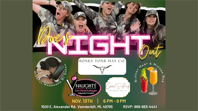 989-983-4441Doe’s Night Out, Thurs., Nov. 13th, 2025 from 6 p to 9 pm at 1500 Alexander Road, Vanderbilt.