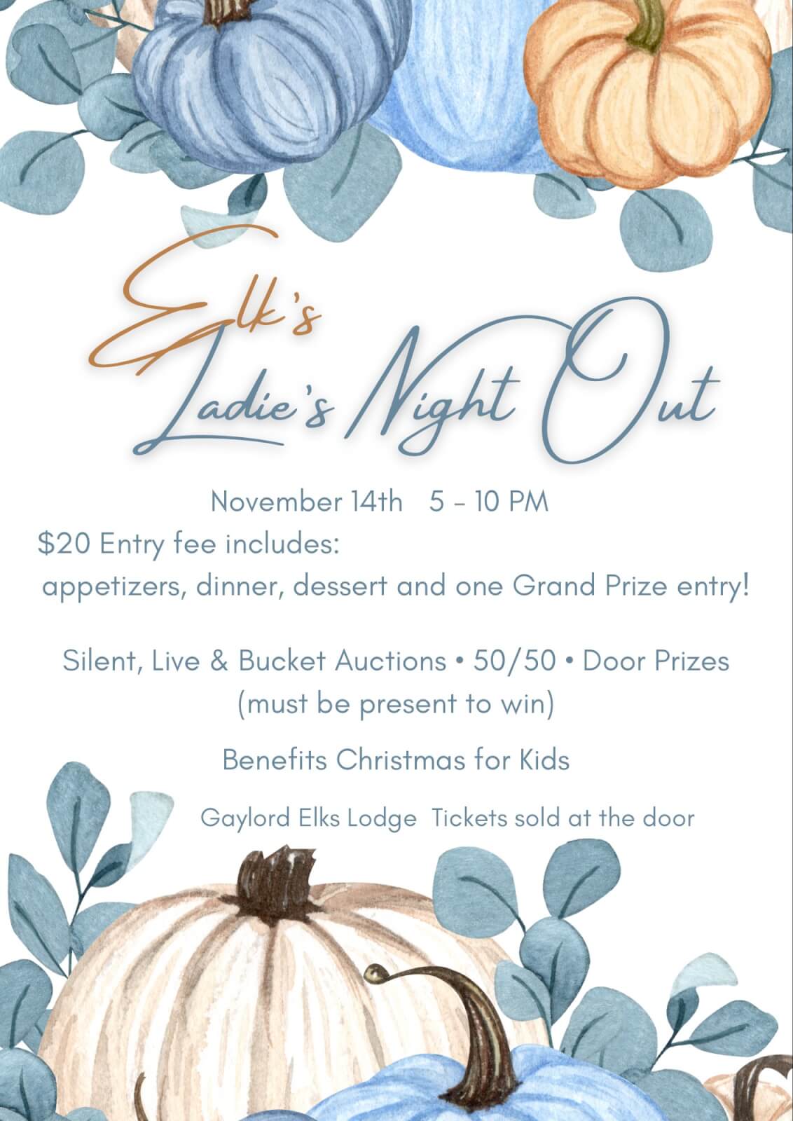 (989) 732-2793Calling all the Ladies!!!! It’s that time of year!!! Come out have a great Friday night, GAYLORD ELKS LADIES NIGHT OUT!! Help support the local community while having a great time. Hope to see you all there!! Friday, Nov. 13th from 5 pm to 10 pm, located at 116 Grandview Blvd, Gaylord. $ 20 Entry Fee includes: Appetizers, Dinner, Dessert and one Grand Prize entry. Silent, Live and Bucket Auctions, 50/50, Door Prizes (must be present to win). Benefits Christmas for Kids. Gaylord Elks Lodge Tickets sold at the door.