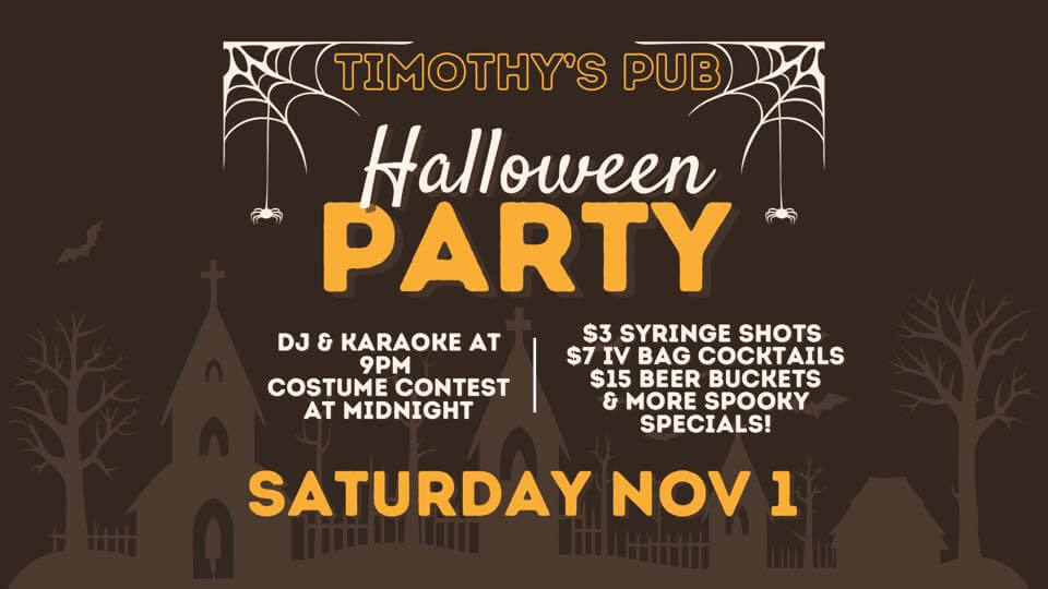 The festivities kick off at 9pm with the start of our Spooky Karaoke, DJ will play all night long. Bring your A-game, costume contest voting is at midnight. First place is a cash prize, second and third earn a Timothy’s Pub gift card!