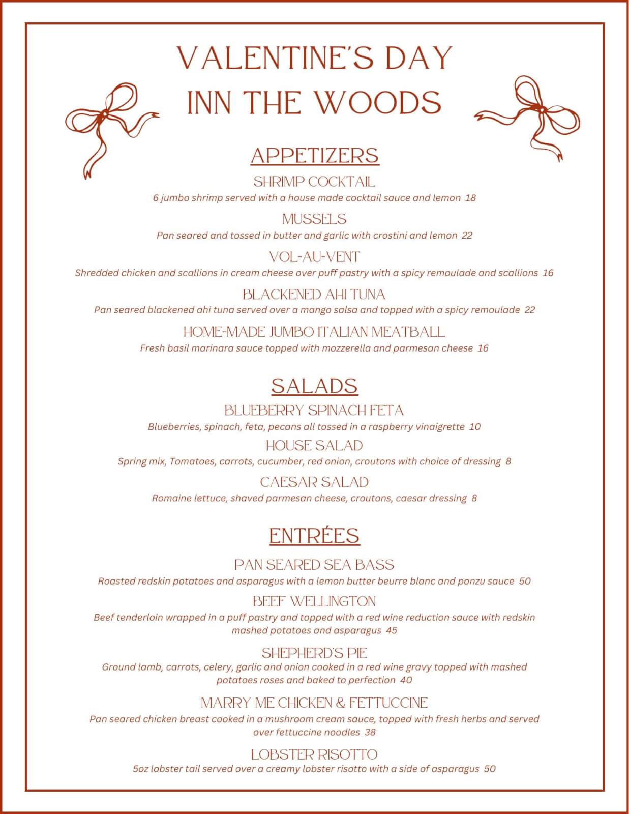 Valentine’s Day at Tavern Inn The Woods, Sat, Feb. 14th, located at 1535 Opal Lake Road, Gaylord. Check out their Facebook web site. For full menu.
