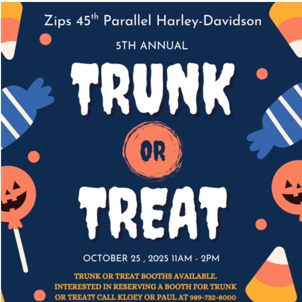 Welcoming all ghouls, witches, and goblins! See you for the candy, haunted service department, and Halloween fun! Zips 45th Parallel Harley-Davidson, located at 980 S Wisconsin Ave, Gaylord, Oct. 25th, 2025, from 11 am to 2 pm. FREE Admission