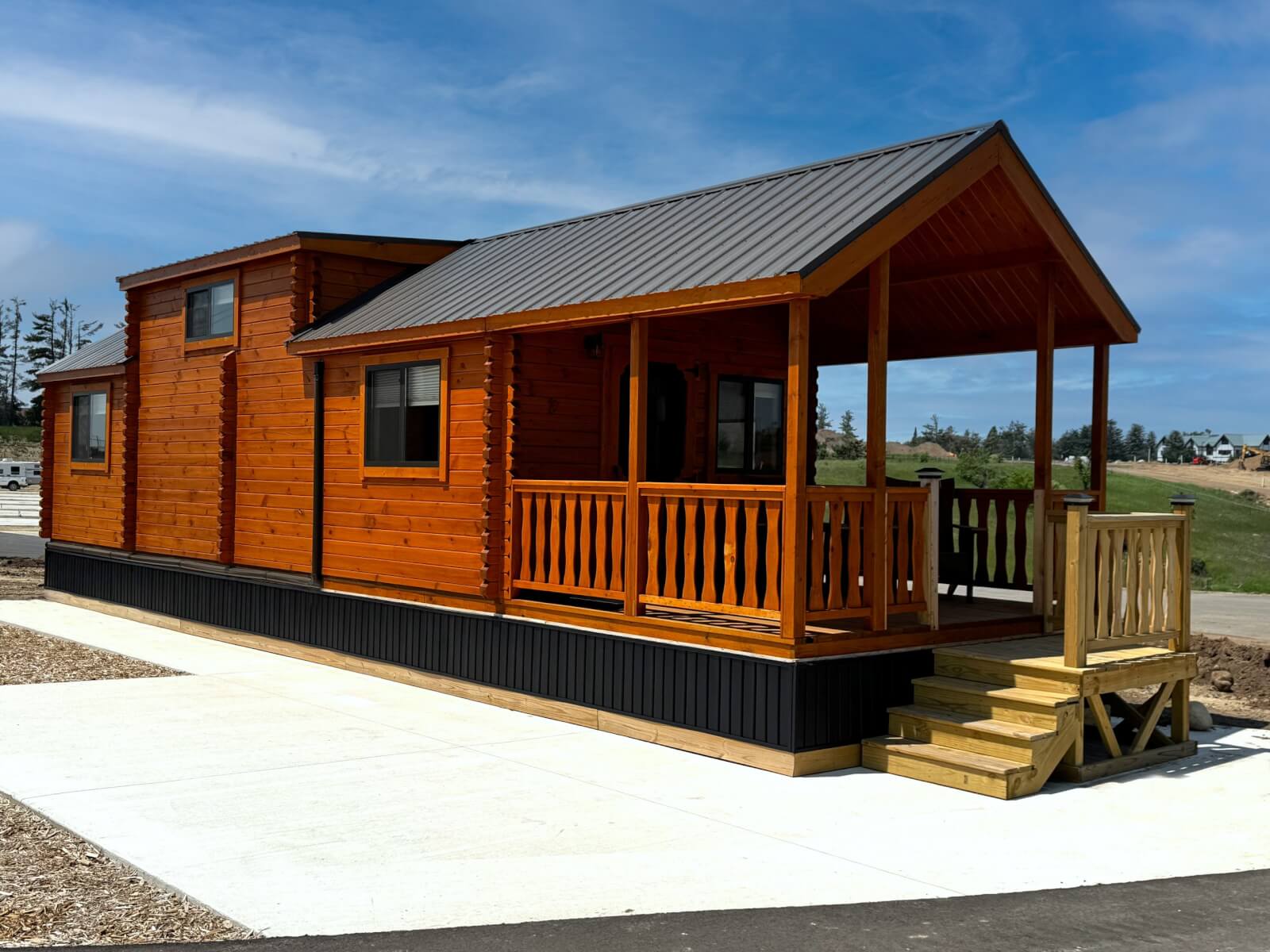 The tiny home cabins at Alpen Bluffs include a loft and sleep up to 8 people. They are fully furnished and equipped with a full kitchen, breakfast bar, kitchen table and chairs, television, couch/futon, bathroom with stand-up shower, exterior porch, heat and air conditioning. Seasonal amenities include access to the beach at an aquatic playground, mini-golf, gem mining, pickle ball, jumping pillow, playground, outdoor pool, sand volleyball courts, outdoor movie theatre & container bar, on-site restaurant, indoor golf simulators and outdoor lawn games.