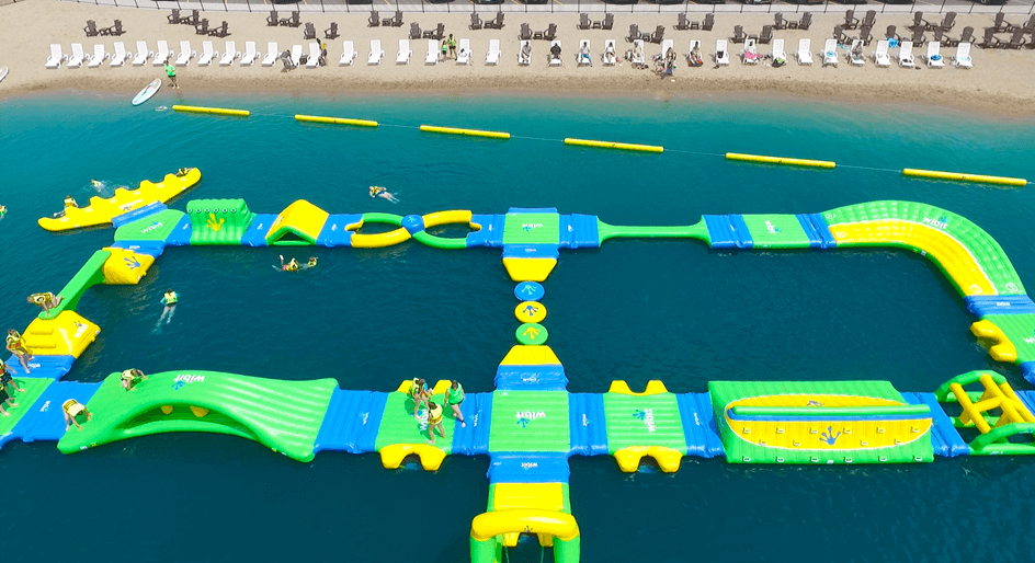 Set within Alpen Bluffs Outdoor Resort, just minutes from downtown Gaylord, Inukshuk Shores features a floating inflatable water course that challenges guests 7 and up to climb, slide, bounce and balance their way through the day.
