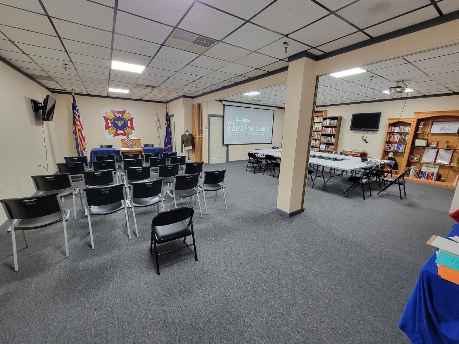 The Landing Zone has the capacity for 60 people, depending on configuration. The room can be divided for breakout sessions or to host smaller groups of 25 – 35. The venue has Wi-Fi, large screen AV capability, a separate bathroom and entrance from the bowling center and easy parking. Full thermostat control and handicapped accessible. A full-service bar and food service catering is available, along with access to the regular menu. Great for corporate or family gatherings. And all proceeds go to 501c3 veteran non-profit. Win-win for everyone.